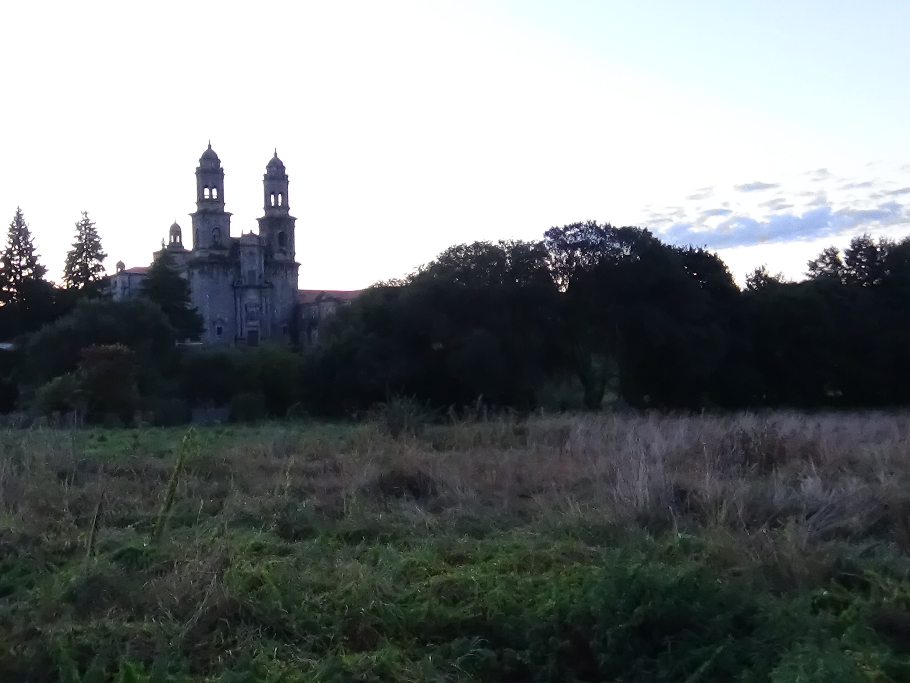Lekker bijgeslapen, dat was nodig. Eerst een compeed op mijn blaar, om 8 uur loop ik naar buiten, direct Fransman Stefan tegen het lijf. Ik vraag hem of hij op weg is naar de ontbijtbar? Nee, die verderop is dicht, voor ontbijt moet ik een paar honderd meter terug naar de bar tegenover Albergue Lecer. We nemen afscheid en ik loop terug, mazzel dat ik hem tegenkwam. Bij de bewuste bar een lekker ontbijtje, daarna via een klein straatje Sobrado uit met een terugblik op het indrukwekkende klooster.