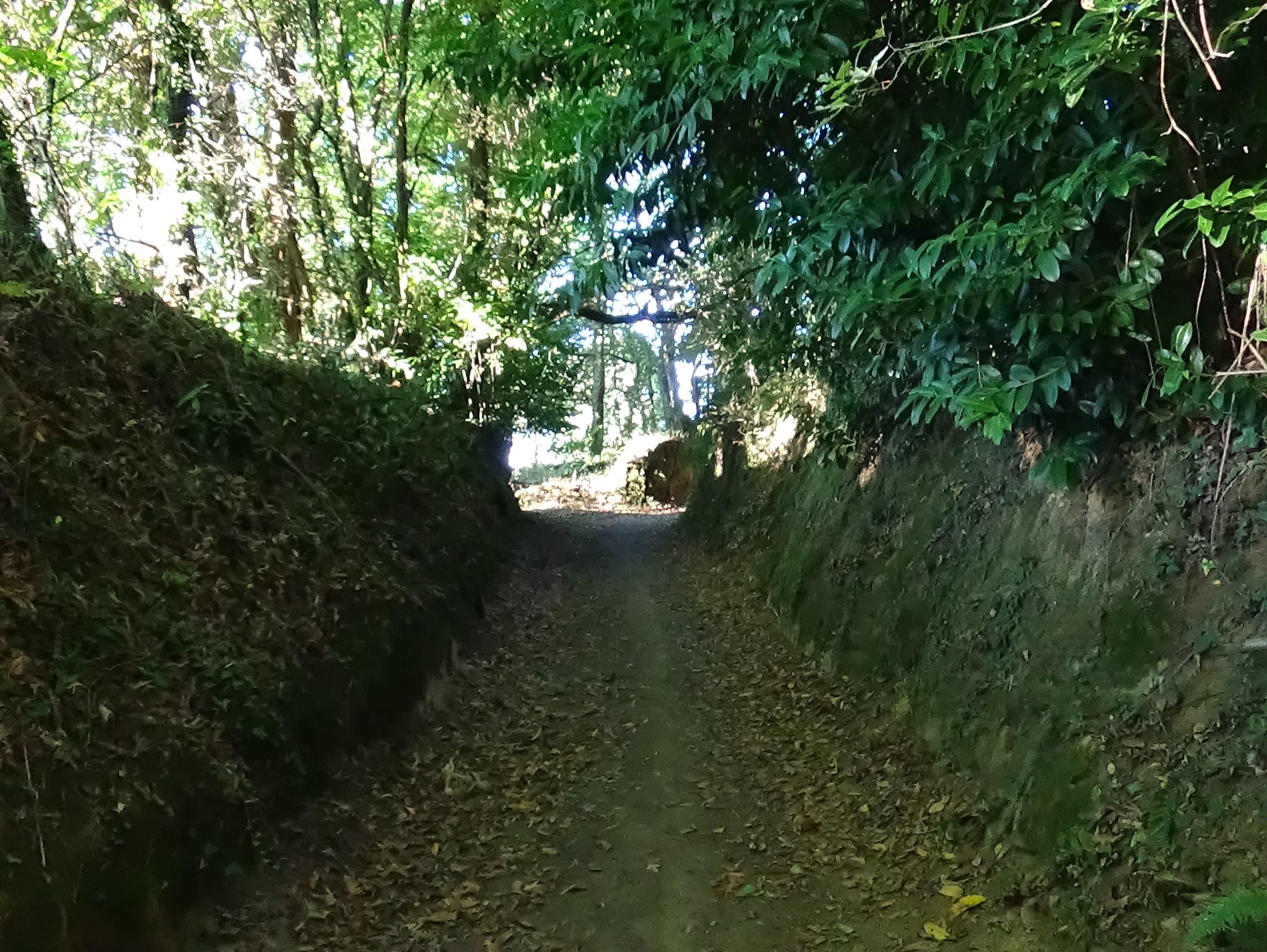 De route is afwisselend over kleine asfaltwegen, bos- en natuurpaden, met mooi uitzicht, gewoon aangenaam wandelen. Ik heb geen last van mijn blaar, het wandelen gaat goed. In de buurt van het gehucht Peruxil een mooie holle weg.
