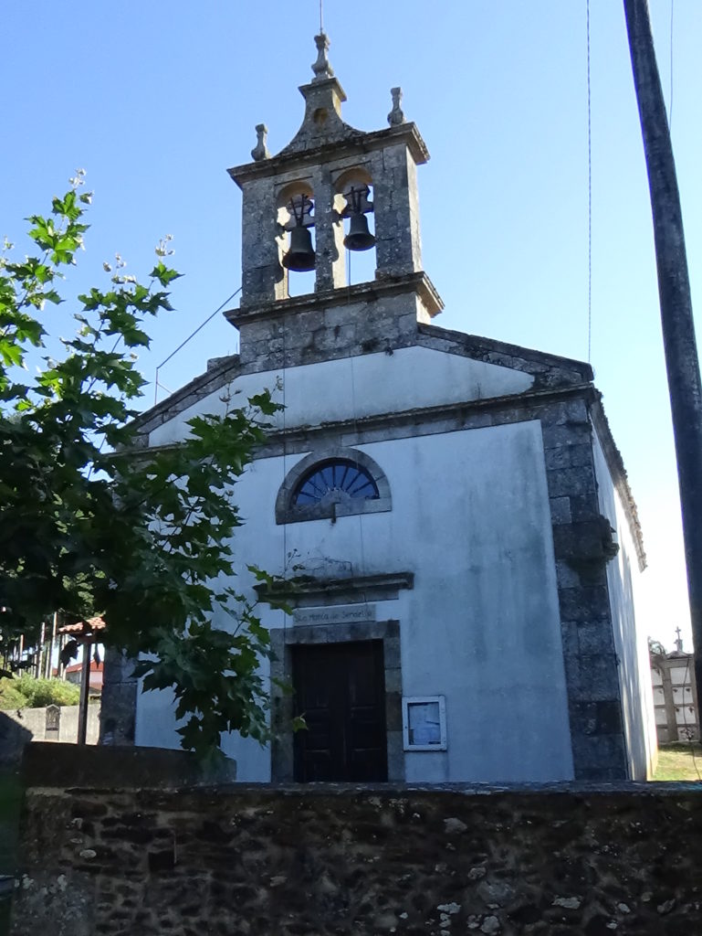 maar zodra we Boimil inlopen is het gedaan met de pret. Eerst een paar km door de woonwijken van Boimil en Boimorto, waar we vergeefs proberen een stempel bij de Oficina de Turismo te krijgen. De borden staan er nog wel, maar de oficina bestaat al even niet meer. De rest van de route gaat over asfalt, over en door het laaggebergte met boerenbedrijfjes en boerengehuchtjes. Na bijna 14 km komen we in Sendelle waar mogelijk een bar is. Zoals zo vaak, dicht. Wel een aardig kerkje, de Santa María de Sendelle.