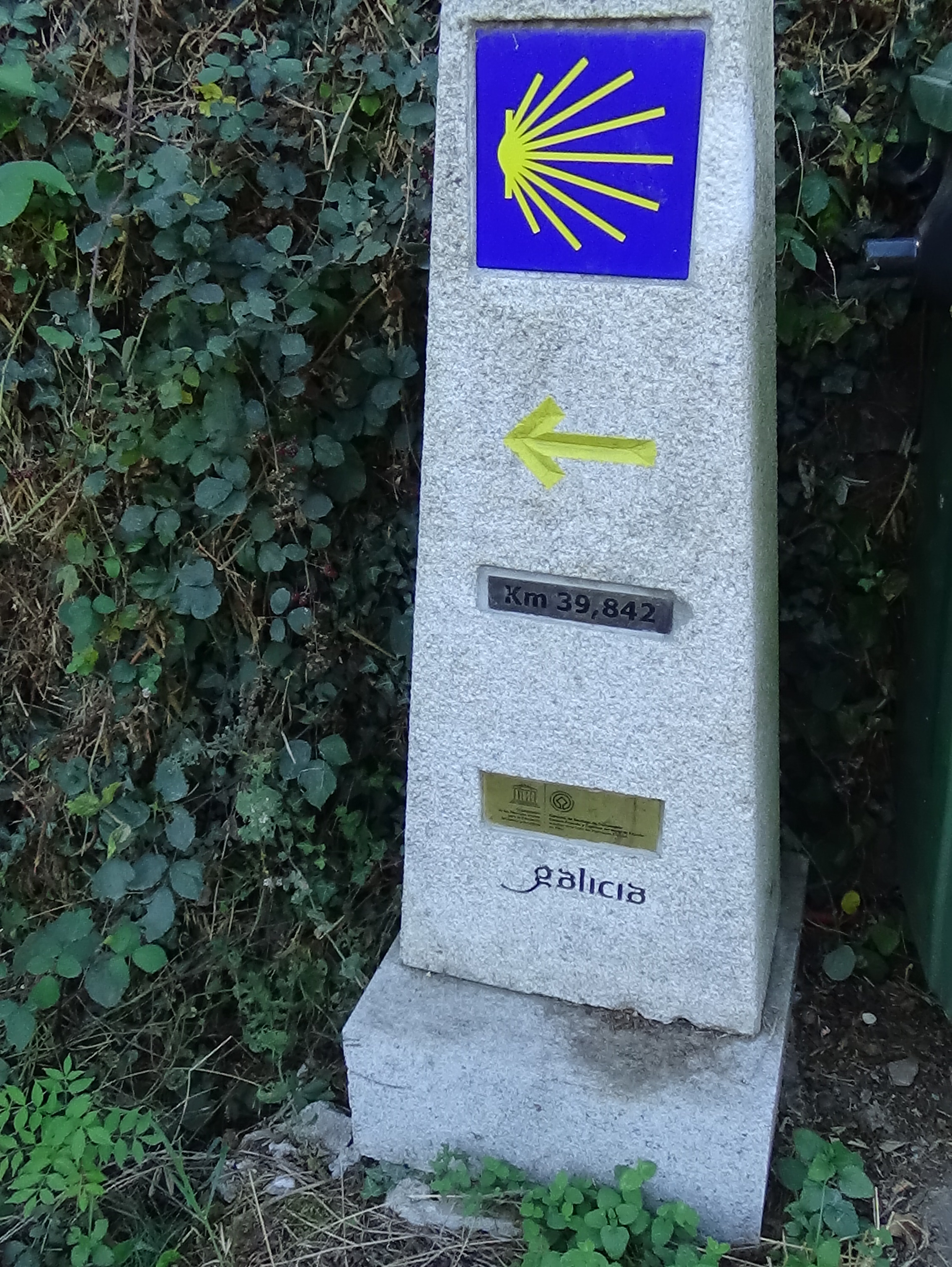 Wijs geworden door gisteren pak ik mijn kans bij een bushokje, een kwartiertje rust hier en mijn appel eten. Ietsje verder, kort voor Arzúa, geeft een paaltje aan dat het minder dan 40 km is naar Santiago.