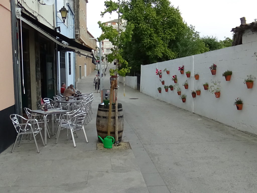 Terug naar mijn kamer, douchen, wasje doen, buiten voor mijn raam hangt een waslijn, super. Rusten, scheren (was ik eerder vergeten), beneden geregeld dat ik morgen om half 9 ontbijt krijg, en terug het centrum in. Meteen op de hoek van de drukke N-547 zit Debby met enkele Engelse vrouwen te kletsen. Ik bestel een biertje en ga erbij zitten, maar al snel verkas ik naar binnen. Veel te druk buiten, zowel het verkeer als het geklets. Hier binnen kan ik rustig schrijven en lezen, merk toch wel dat ik me het beste voel zo in mijn uppie, of met iemand erbij, maar niet dat massale.