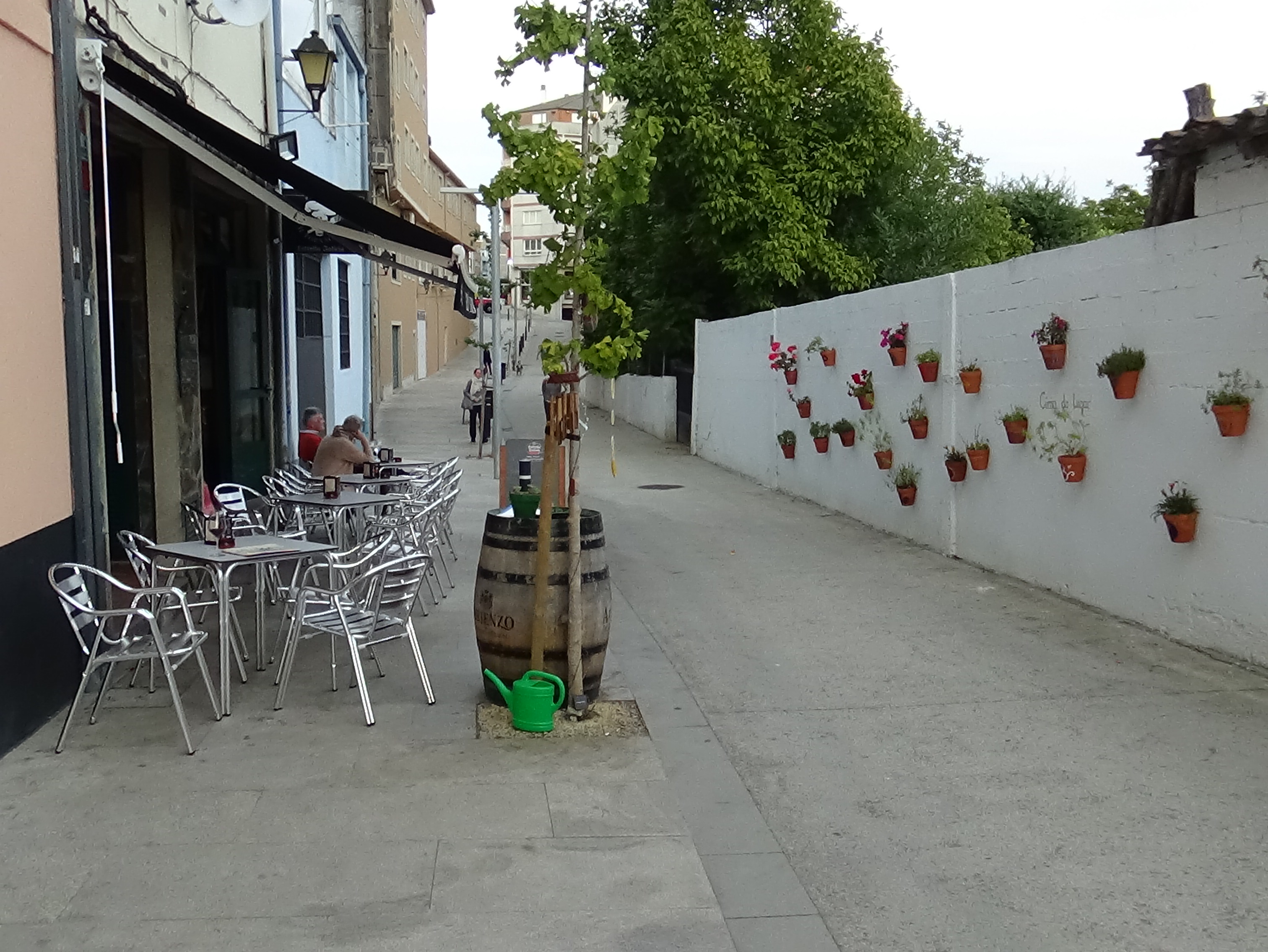 De weersvooruitzichten voor de komende dagen zijn niet best; de lucht begint al te betrekken, dus die regen vannacht zal wel komen. Afijn, 2 weken mooi weer gehad, dus niets te klagen. na dit biertje ga ik een uitgebreid rondje centrum doen, de caminoroute door Arzúa filmen, want morgenochtend sla ik daarvan een stukje over rechtstreeks vanuit mijn pension. Bovendien is het afwachten wat het weer morgen doet. Tjonge, wat een drukte met pelgrims, zelfs nu op 10 oktober! Met grote rugzak, kleine rugzakjes, zonder rugzak, alle soorten komen voorbij. De hele infrastructuur is er op ingericht: talrijke bars en restaurants, wasserijen, zelfs nog een internetcafé. Ik scoor hier ook mijn recordprijs in een supermercado, € 0,20 voor een 1,5 literfles water. In een rustig stukje langs de camino, uit de inmiddels frisse wind nestel ik mij met een koffie op het terras, langslopende pelgrims observeren.