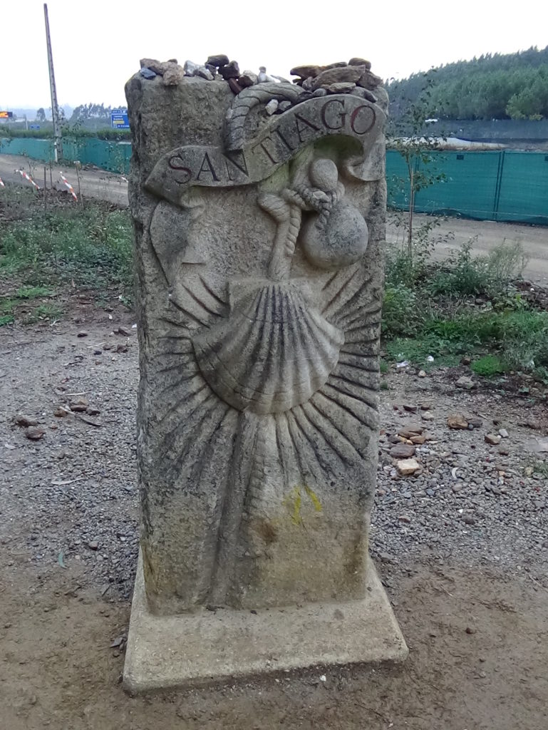 Vlak bij het vliegveld van Santiago kom ik bij een modern pelgrimsbeeld.