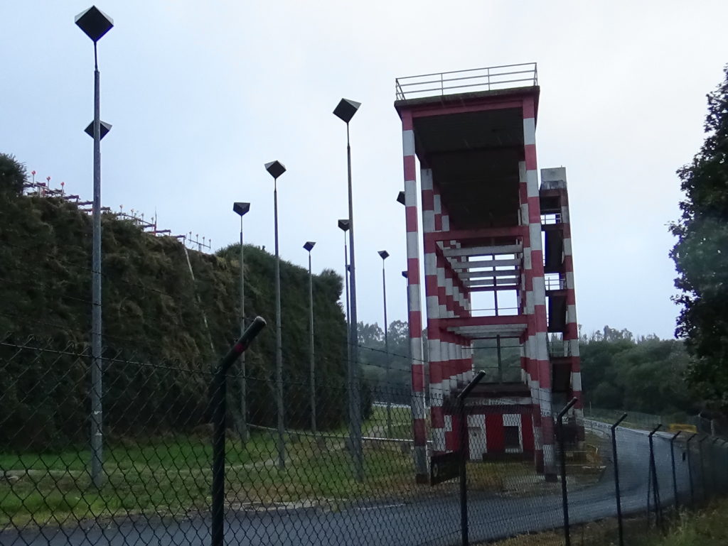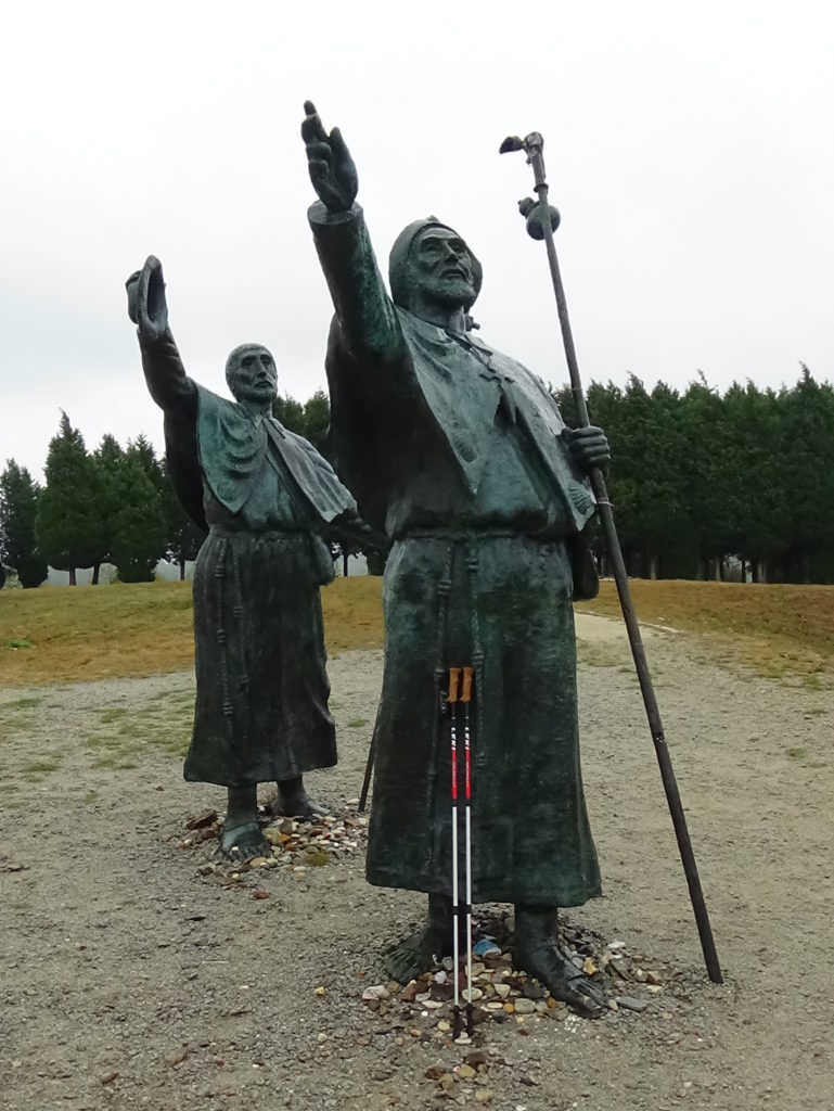 en meteen daarna over een bruggetje waar 2 beken in elkaar vloeien. Nog een uur lopen, ik kom aan bij Monte do Gozo, het regent inmiddels behoorlijk. Toch besluit ik hier zo’n 400 meter van de route af te gaan, langs het monument tere ere van het pausbezoek begin jaren 90, op weg naar het pelgrimsbeeld. Twee keer eerder was ik in Monte do Gozo, de berg van de vreugde, maar nog nooit bij dit pelgrimsbeeld.