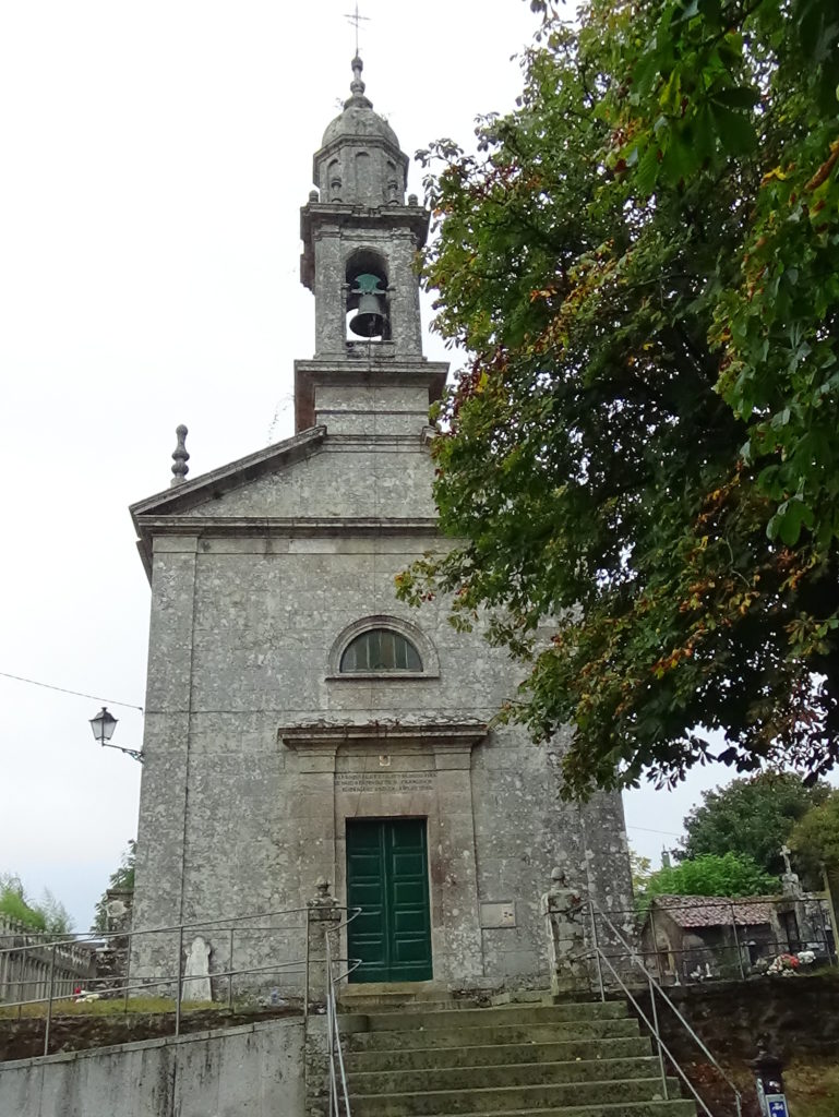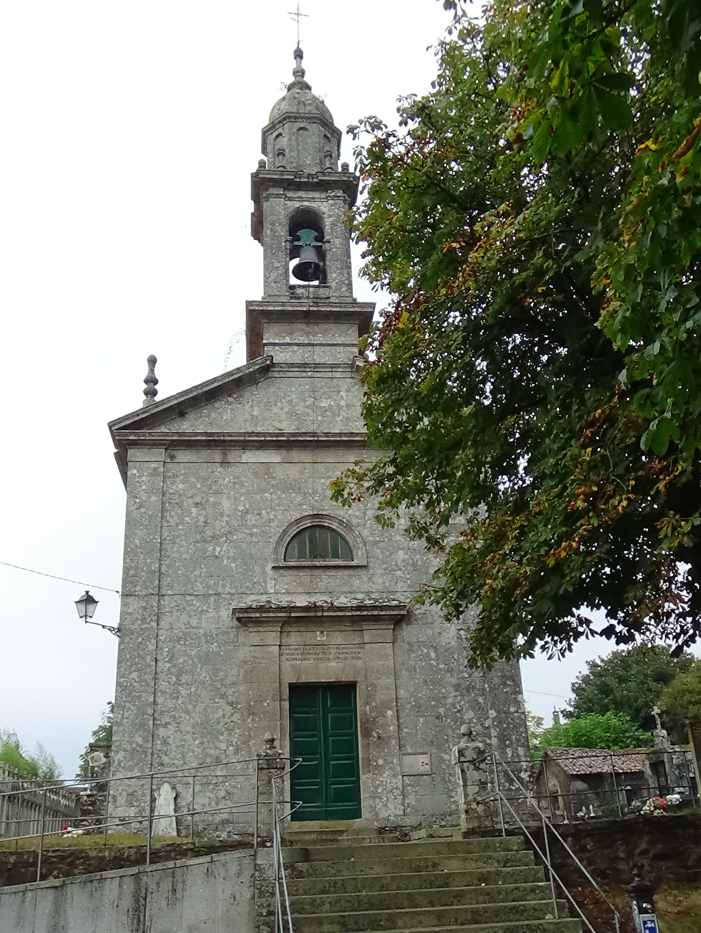 Nog geen 5 minuten later kom ik in San Paio bij Casa Porta de Santiago, stampvol met natte pelgrims. Gelukkig komt er net een stoel aan een tafeltje vrij, zodat ik hier rustig mijn koffie kan drinken. Een stempel krijg ik hier niet, een van mijn collega-pelgrims heeft de stempel geleend maar niet terug gebracht, foetsie dus. Na de koffie vertrek ik zonder poncho, maar nog geen kwartier later gaat het te hard regenen, jammer. Weinig verder loop ik Lavacolla in, kom langs de kerk,