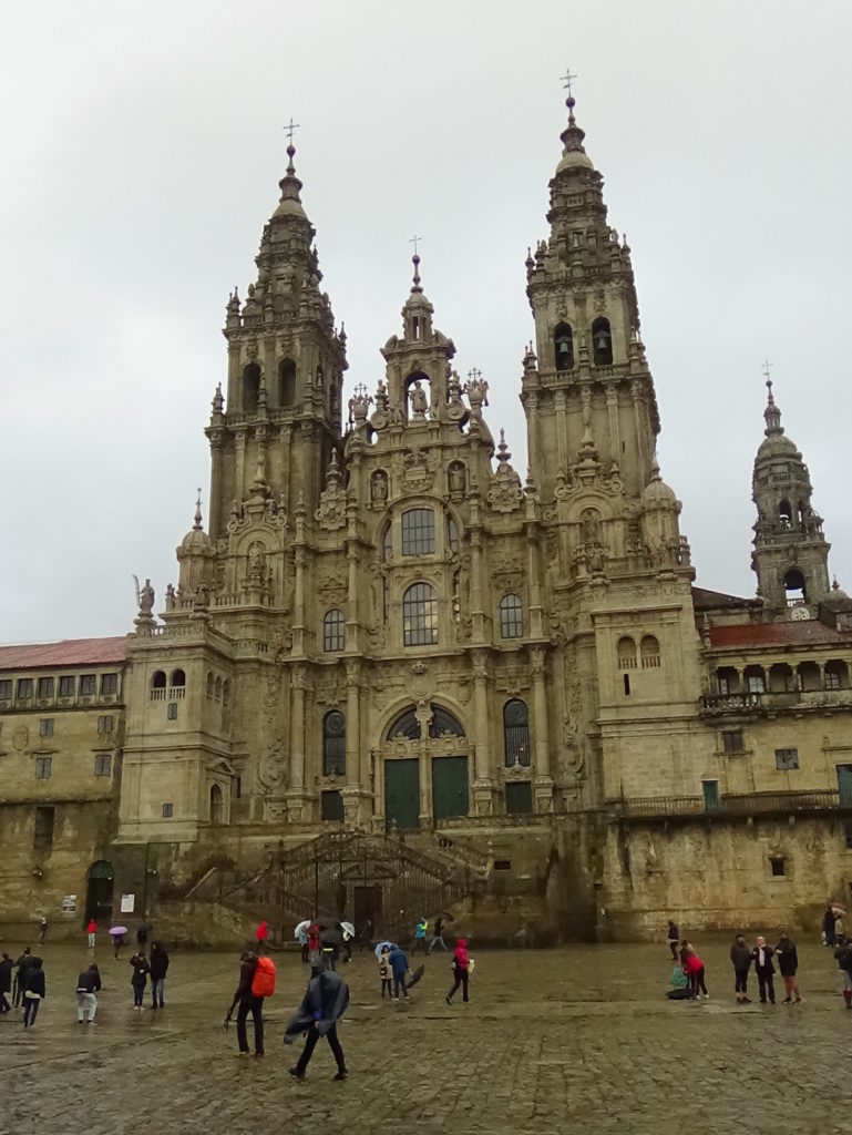 ’s Middags komt de zon er zelfs door, met een vest aan zit ik eerst een tijdlang op de stenen banken van de Praza da Quintana, daarna op het terras daar. Er valt veel te zien, toeristen en pelgrims vooral.