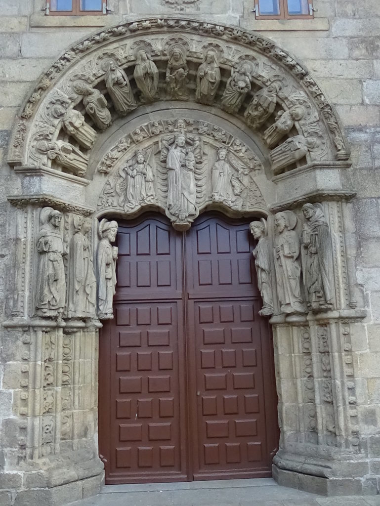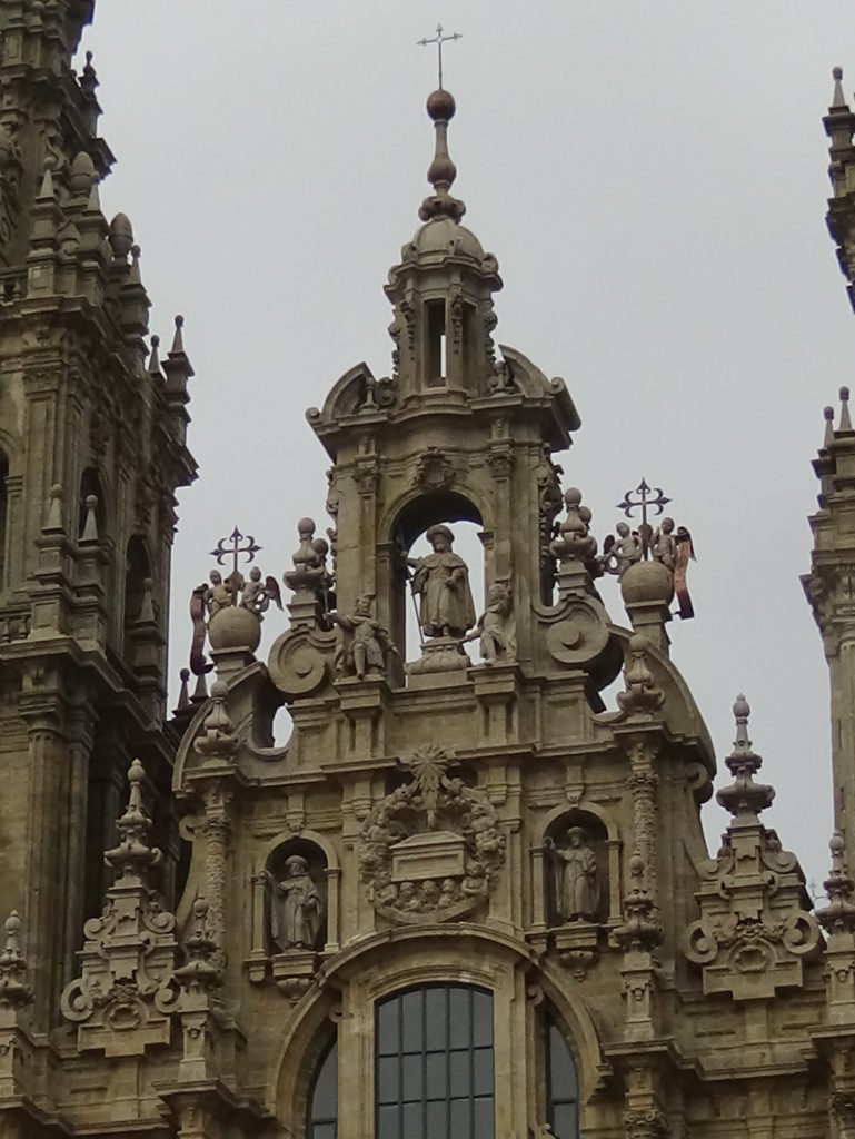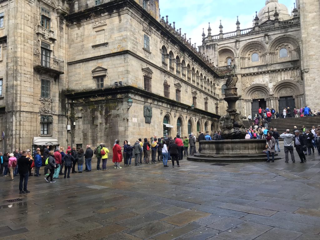 Zondagochtend regent het nog steeds, ik ga om de hoek ontbijten bij Casa da Balconada. Geleidelijk aan wordt het wat droger, om half 11 kom ik langs de ingang van de kathedraal aan de Praza das Praterías. Het hele weekend is het al druk in Santiago, mede door de feestdag van 12 oktober (vanwege de ontdekking van Amerika door Columbus), en bij de ingang staat nu al een hele rij voor de mis van half 1.