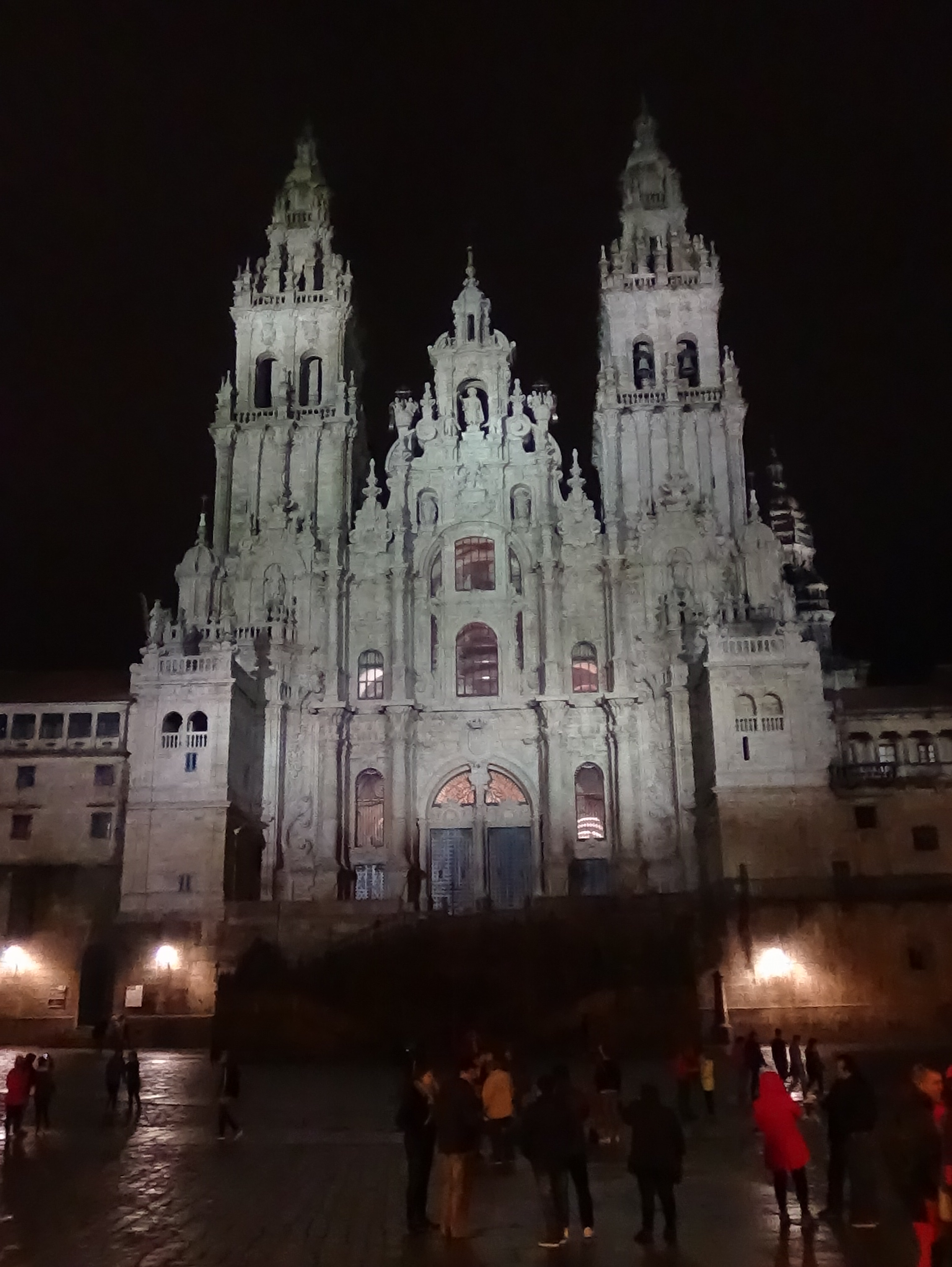 We besluiten naar tapasbar Petiscos do Cardeal te gaan. Erg goed gegeten hier, en gezellig gezeten, aardige bediening. Even kort twee Belgische dames gesproken aan een tafel naast ons, zij zijn met de fiets vanuit Brussel naar Santiago gekomen. Daarna neem ik Kurt mee naar Café The Bistro in de Rúa do Vilar, voor een afsluitende koffie met een neutje. De komende dagen zullen we waarschijnlijk ieder ons eigen plan trekken, Kurt gaat zondag met de bus naar Finisterre. Ik loop nog even naar de kathedraal voor een blik bij avond, het blijft een mooi gezicht.