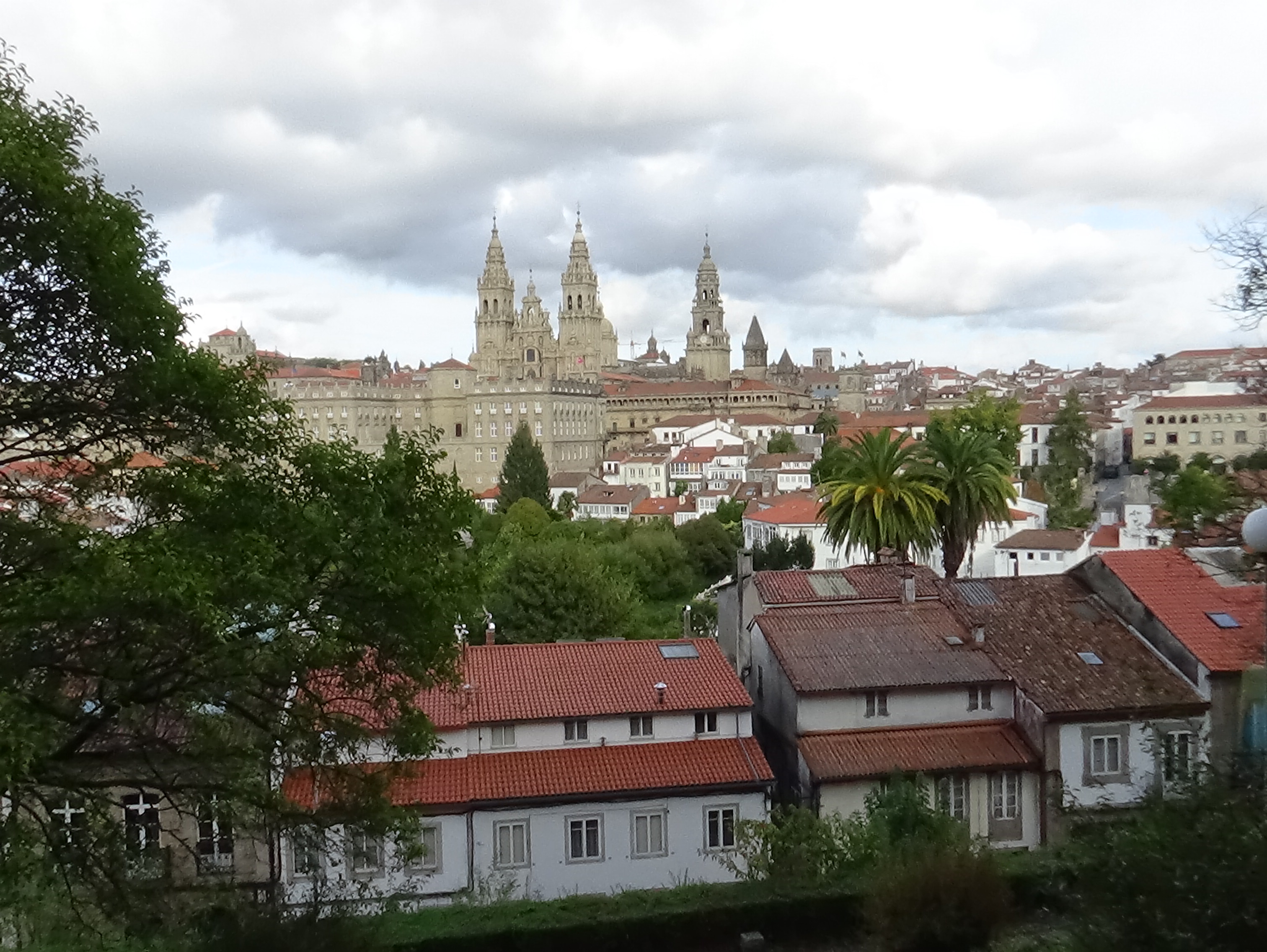 Dat maakt toch indruk op me, vanaf hier keken de pelgrims vroeger over de stad uit en zagen de kathedraal liggen. Dat laatste is vandaag wat moeilijker, niet alleen door de vele nieuwere bebouwing ervoor, maar vooral door het grijze weer. Ik ben toch blij dat ik ondanks dit natte weer de moeite heb genomen hierheen te gaan.