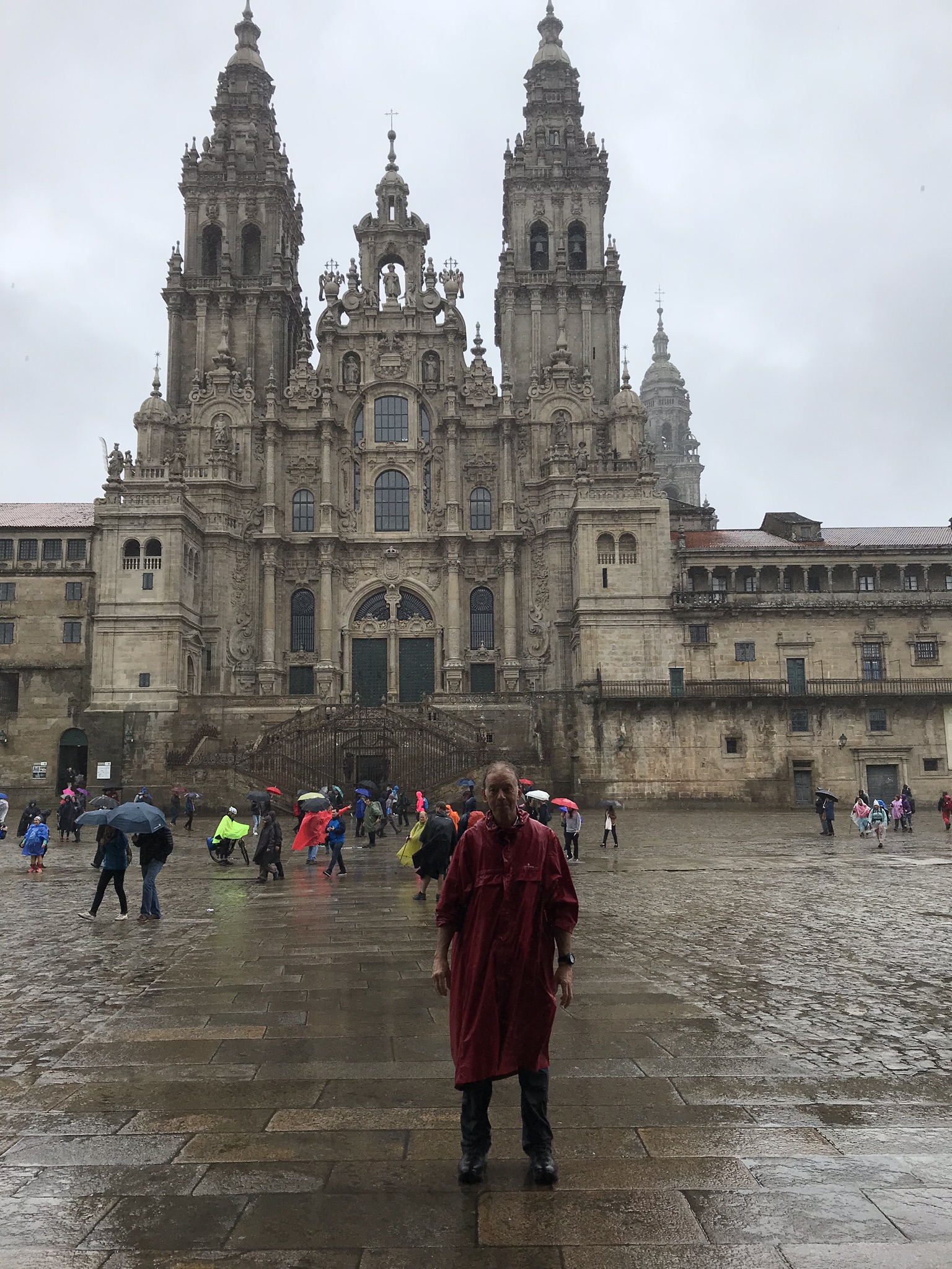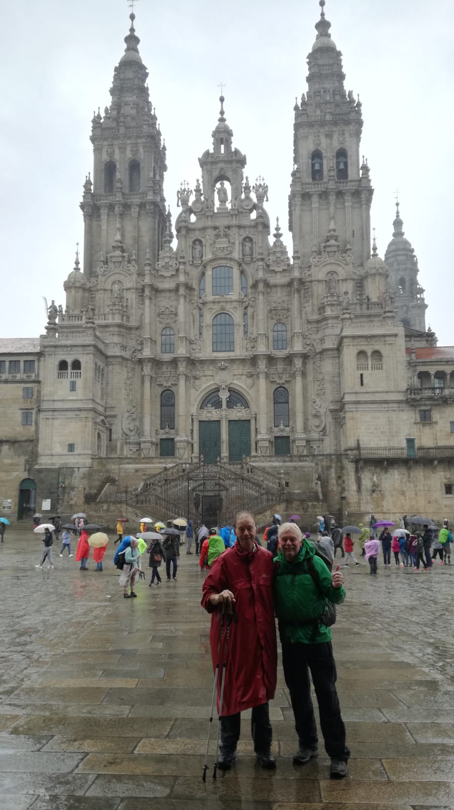 Terug naar de camino, de regen sopt via mijn natte broek en sokken in mijn schoenen, en via de kraag van mijn poncho naar binnen, mijn polo wordt kletsnat. Eigen schuld, ik heb de capuchon niet opgedaan, het kan me ook weinig schelen, de laatste dag mag alles nat worden. In een rap tempo loop ik door de oninteressante straten van de buitenwijken, tot ik vlak voor het betreden van de oude binnenstad via de Porta de Camino mijn naam hoor roepen; Kurt komt in de deuropening van een bar! Even naar binnen, kletsen, een witte Albariño drinken op onze aankomst, al staand, want er is geen zitplek vrij. Samen lopen we de oude stad binnen, via de Praza de Cervantes naar rechts richting kathedraal, de mij zo bekende trappen af naar de Praza do Obradoiro. Kurt is hier voor het eerst en onder de indruk, ondanks het rotweer. Onder de bogen van het stadhuis tegenover de kathedraal schuilen we, en maken foto’s van onszelf.