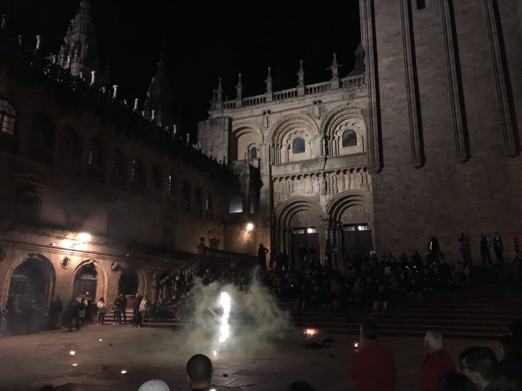 Voor het avondeten een wandeling door het park Alameda met mooi uitzicht op de kathedraal. Voor de 3e keer naar Petiscos do Cardeal waar ik geen spijt van heb. Op de Praza das Praterías is ’s avonds een spektakel aan de gang met vuurblazers.