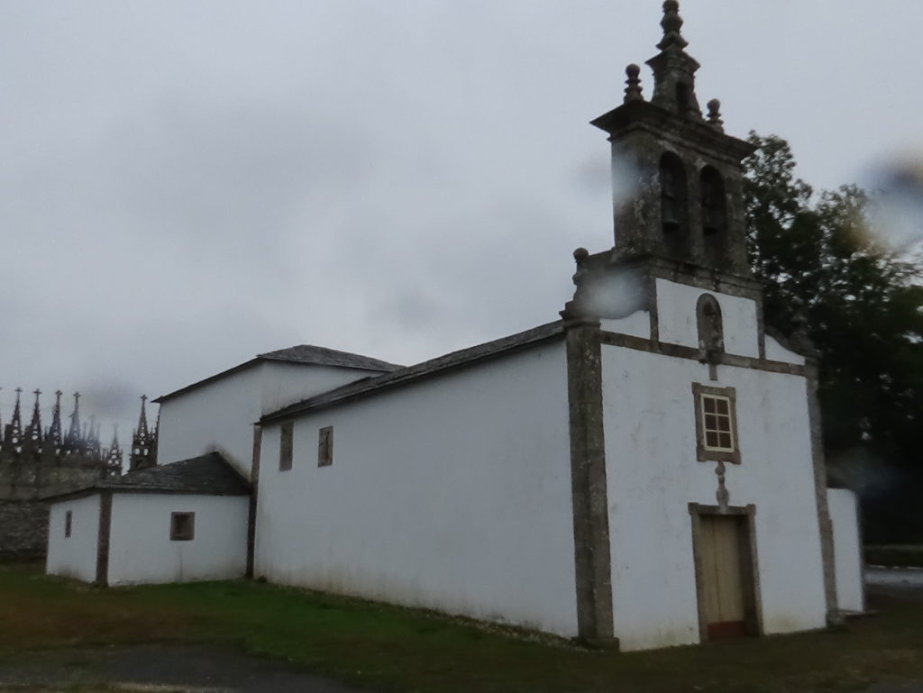 Dan wordt het een beetje knijpen, ik moet dringend naar de WC. Gelukkig, in Goiriz even van de route af naar de N-634 waar een bar is. Weer koffie met een chocoladekoek. Ook het Nederlands echtpaar en later Kurt en Debby komen hier binnen, net als de nodige andere pelgrims. na de koffie even hiernaast kijken bij de kerk van Goiriz met bijliggend kerkhof. dat valt op door de grote granieten kruizen die over op de grafmonumenten staan. Dit schijnt te stoelen op het oude Keltische geloof dat deze kruizen het boze afweren.