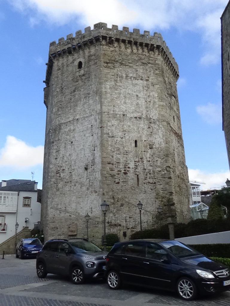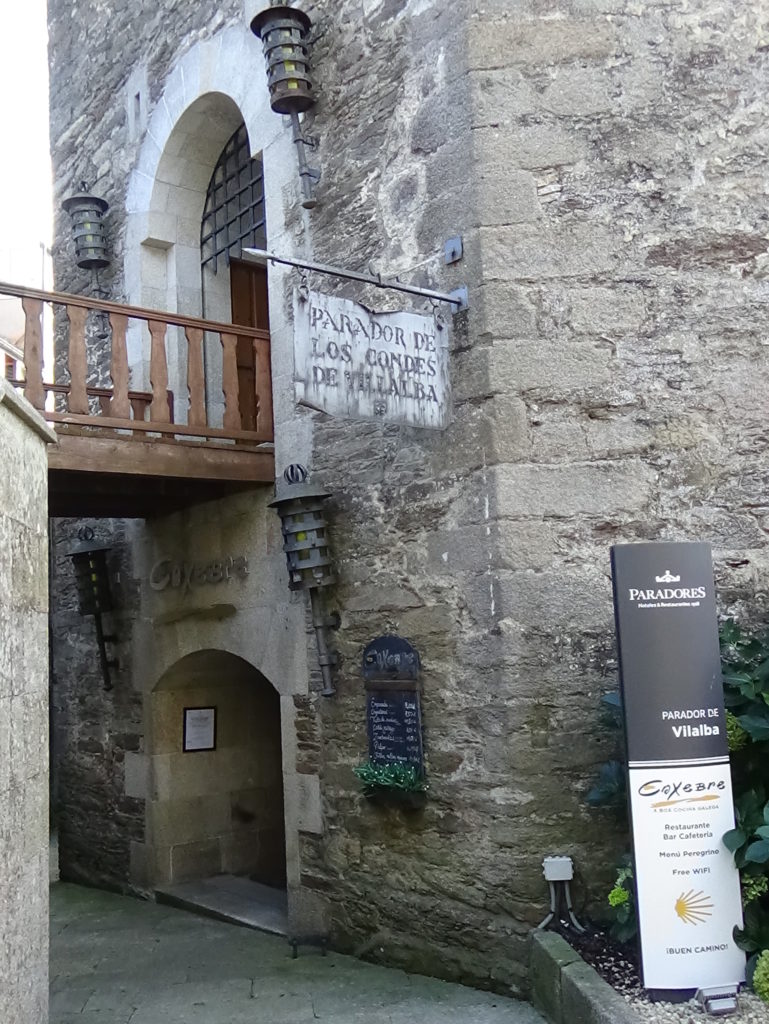 Vilalba kom ik binnen over een lange voetgangersbrug, die mij enigszins overdreven aandoet. Zo druk is het hier nou ook weer niet. Daarna is de route even onduidelijk: de schelp op een post wijst met de open kant richting rechts, maar de pijl eronder naar links. Even checken op mijn mobiel, de schelp heeft het goed. Blijkt later te kloppen als ik borden richting Parador zie, mijn herberg is daar in de buurt. Door de Rúa Porta de Cima ga ik door het oude gedeelte, dan rechtsaf naar Albergue As Pedreiras. Vrij nieuw, ik krijg in de ruimte achterin een onderbed toegewezen van 4 stapelbedden, er gaat ook een trap naar boven met andere bedden. Boven mij ligt een Engelsman, die verhuist later echter naar boven omdat daar een bed is vrijgekomen. Elk bed heeft een locker. Ik ga scheren en douchen, de was laat ik maar zitten vandaag, geen druppel gezweet. Daarna het centrum in, dat stelt weinig voor. De Torre de Andrade is omgebouwd tot Parador.