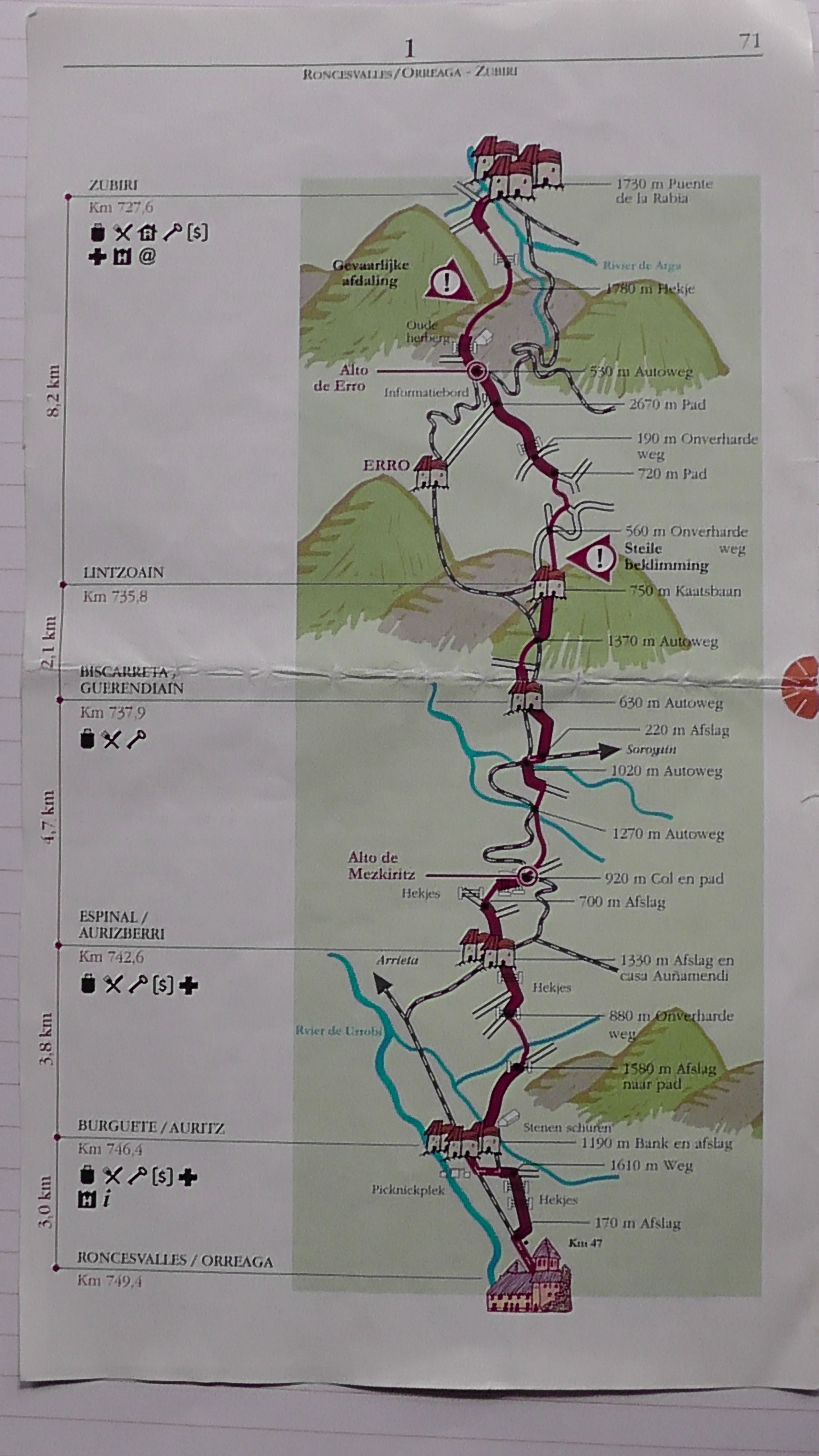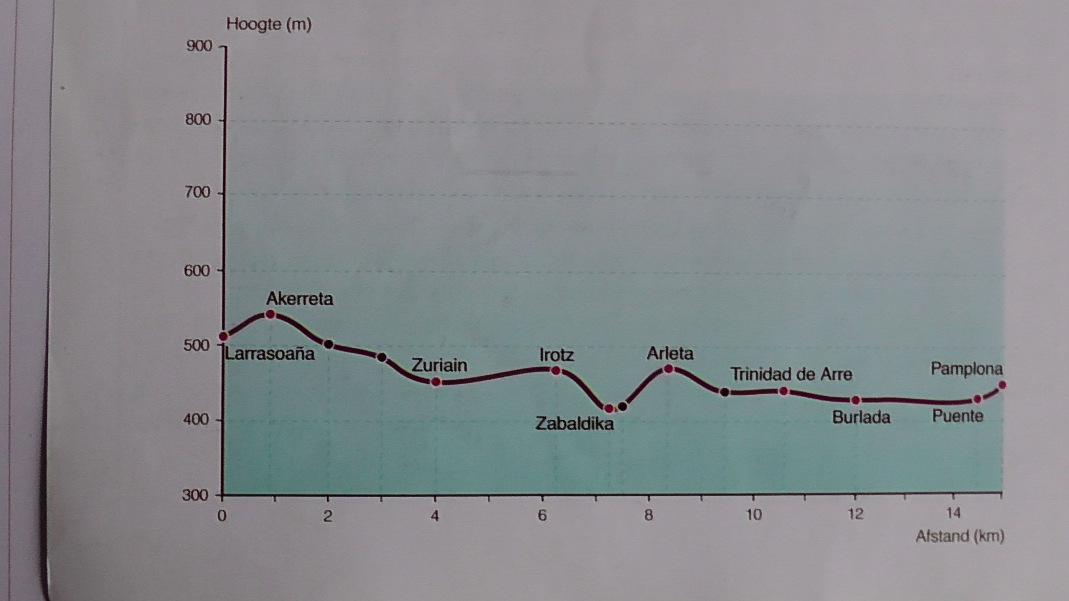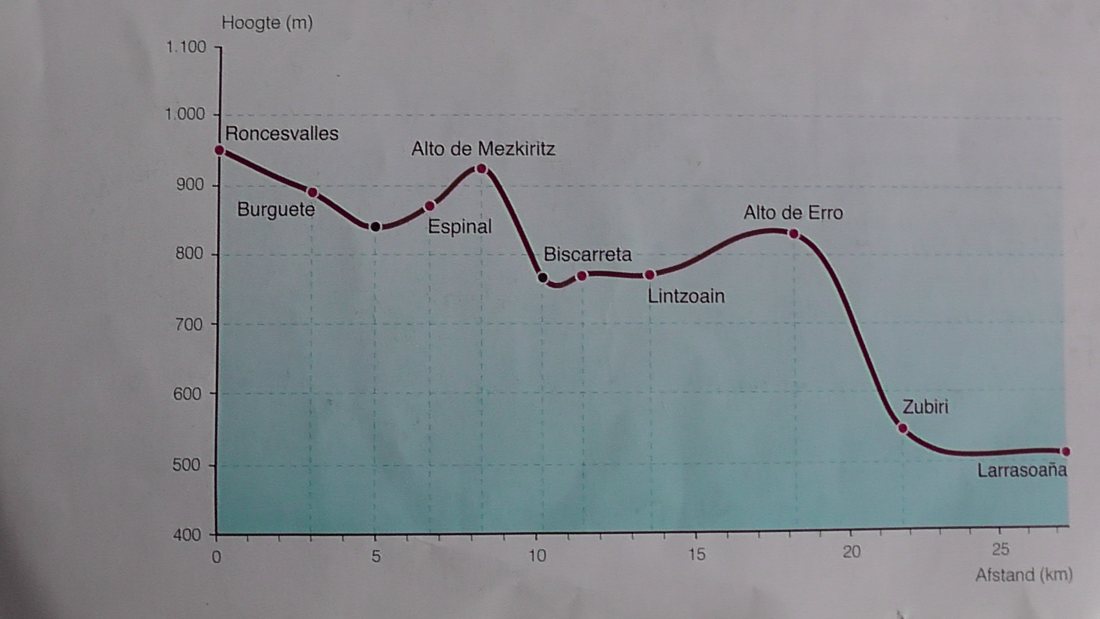 De route betekent wel dat we gaan stijgen, dik 400 meter de hoogte in. Eerst direct omhoog naar de Alto de Erro op ruim 800 meter, weer wat omlaag, en dan de Alto de Mezkiritz op ruim 900 meter. Weer bijna 100 meter omlaag en dan stijgen we naar het klooster in Roncesvalles op 960 meter hoogte.