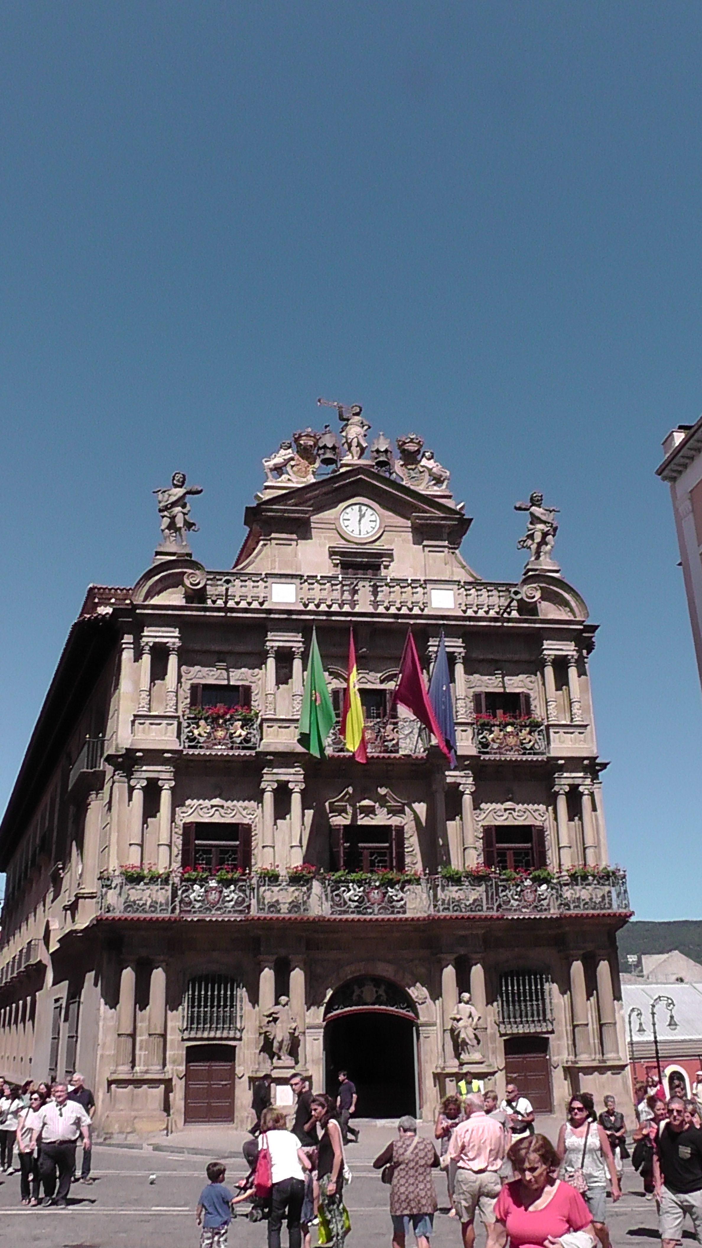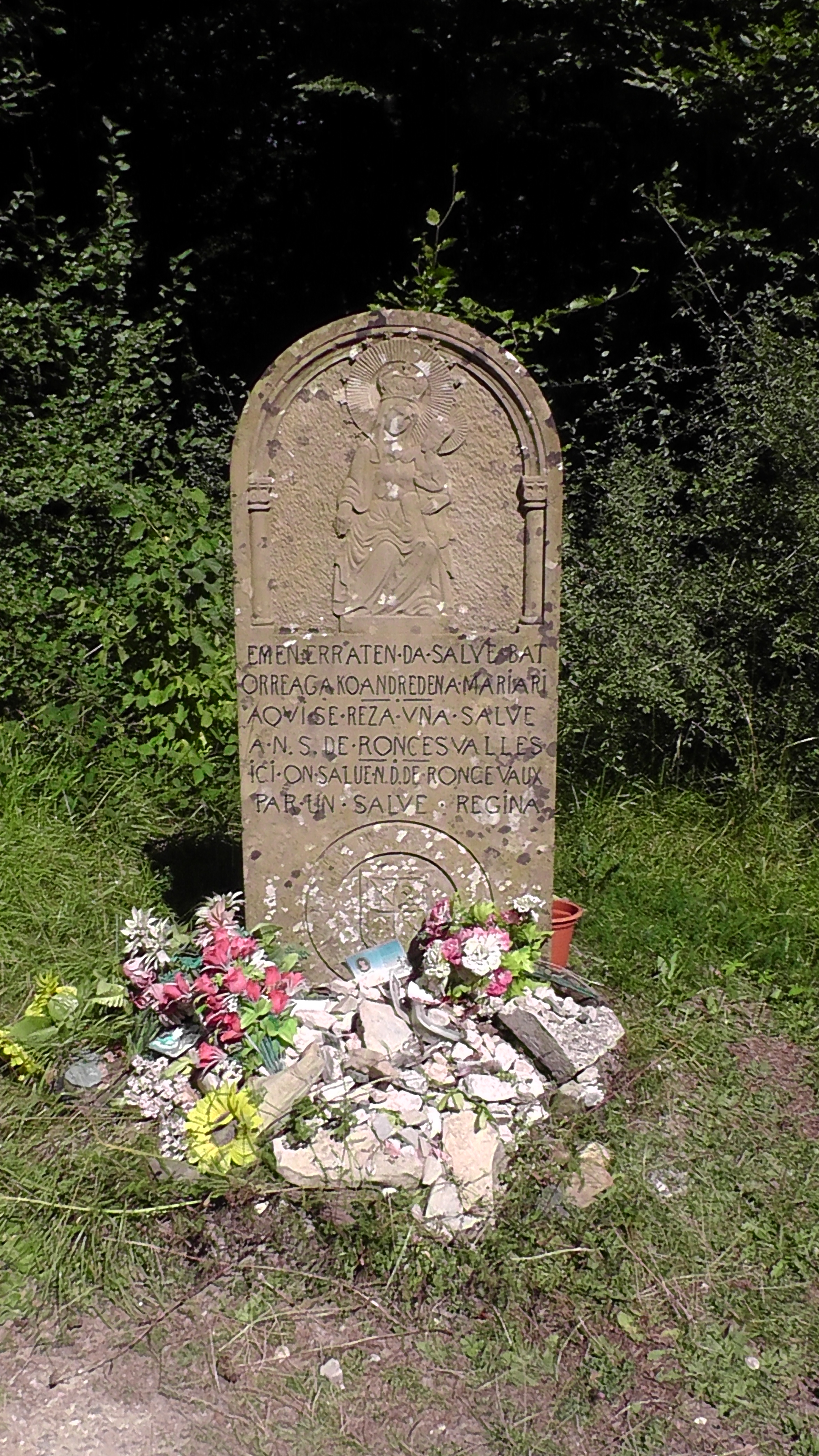 Boven op de Mezkiritz is het druk, een of ander wielerevenement aan de gang. We lopen Espinal door en via een mooi pad komen we in het centrum van Burguete, waar we op het terras alvast een biertje drinken op onze camino die bijna ten einde gaat. Jammer, we hebben het goed gehad, goede onderlinge verstandhouding, prachtig weer, leuke routes met interessante plaatsen. We gaan op pad voor de laatste 3 km naar Roncesvalles, eerst een stukje langs de drukke en smalle hoofdstraat. Dan besluiten we achterlangs te lopen door de calle Roncesvalles, lopen langs het cultuurcentrum daar, en wie stopt er met de auto…Marisol! Welk toeval, Marisol, vaste kracht van het klooster, is vandaag vrij en komt haar dochtertje hier ophalen. Even kletsen, morgen treffen we elkaar weer op onze werkplek.Het pad door het bos van Burguete naar Roncesvalles is bekend en goed te wandelen, al snel zien we de contouren van La Posada en de achterliggende kloostergebouwen. Eerst maar een biertje op het terras daar. Niet lang daarna treffen we de collega-hospitaleros van onze groep, ik besluit in de overloop te gaan slapen. Tonny en Helmut gaan in een nieuwe barak in het campamento slapen, maar dat betekent ’s nachts buitenom naar een sanitairbarak, daar heb ik geen zin in. Jacques gaat zich als pelgrim melden aan de balie en krijgt een slaapplaats in Aterpea, met een luxe bed op de verdieping, en gelukkig niet een oud stapelbed in de sótano (kelder).
