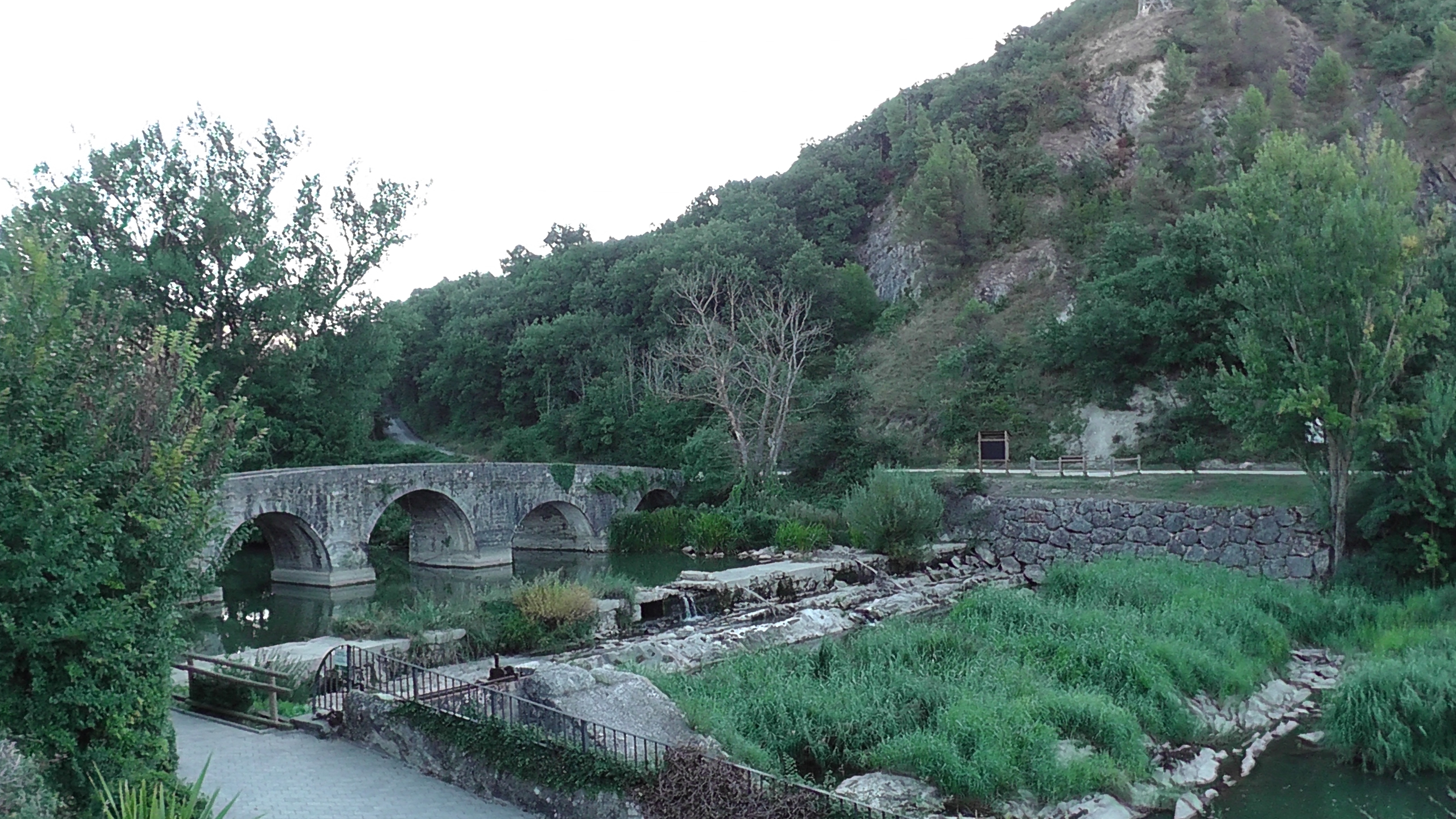 In Larrasoaña duiken we even de route af richting het dorp. De brug over de Arga over het centrum in, maar de bar blijkt dicht te zijn. Dan naar rechts, daar zou een supermarkt moeten zijn. Daar staan we juist voor het gesloten hek van een tuin met terras als de eigenaar aan komt rijden met vers stokbrood; een piepklein winkeltje met zitjes binnen en buiten, én een stempel van Angel. Wij kiezen welk beleg we op brood willen en hij gaat 2 bocadillos voor ons maken, lekker met een koffie en cola op het terras. Daarna weer terug de rivier over voor de laatste 5 km naar Zubiri. Na een uurtje zien we het liggen aan de andere kant van de rivier.