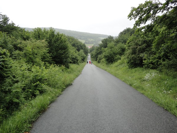 Na een half uur gaan we verder, het regent nog steeds, de eerste 3 uren lopen we in de regen. Wel mooi wandelen door veel bossen, de route daalt van 950 meter tot 500 meter. Onderweg verrassen ons nog een aantal langere, steile klimpartijen. Midden in een bos zijn stukken afdaling bestraat, waarschijnlijk om modderstromen te vermijden. Naar de Alto de Mezkiritz klimmen we 100 meter, ook naar de Alto de Erro een pittige klim van 100 meter hoogteverschil. We hebben een beetje genoeg van het natte weer dus opperen het plan, als het zo blijft, om in Zubiri te overnachten.